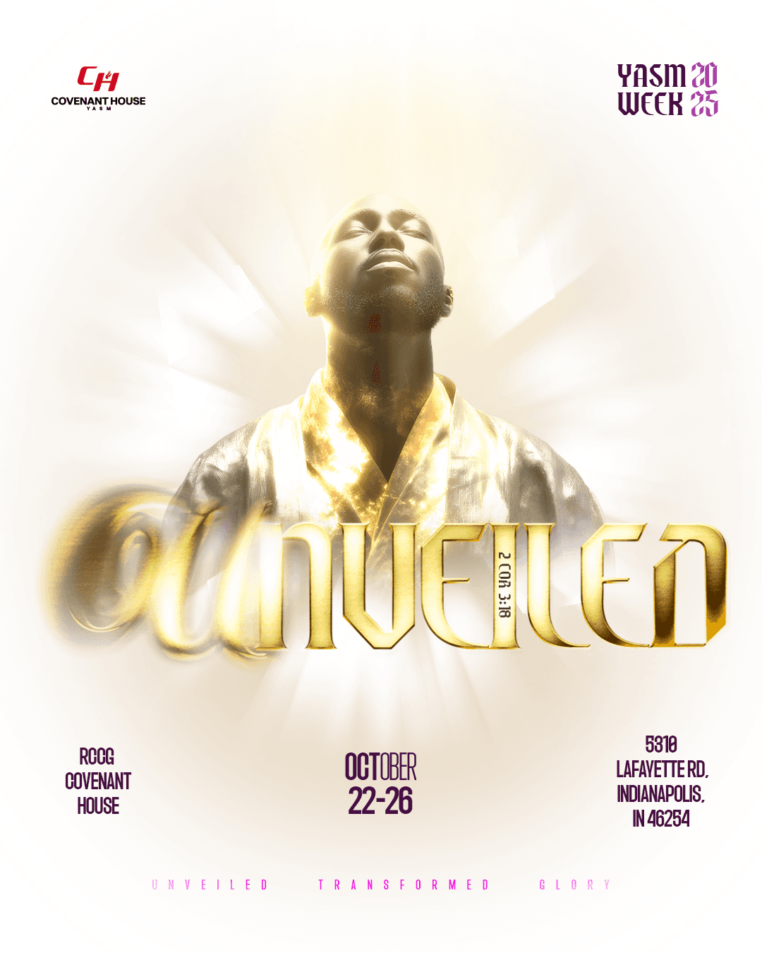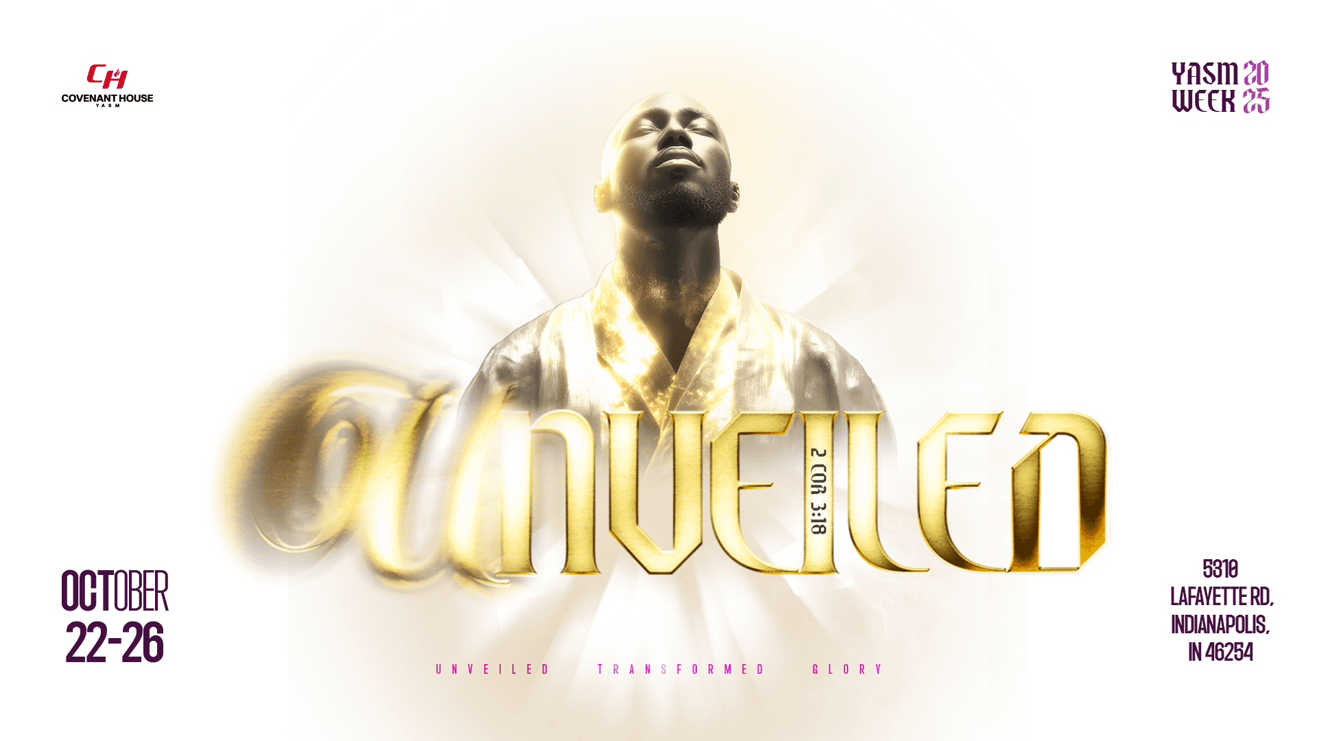 I created the UNVEILED branding as a visually striking identity that captures spiritual transformation through radiant lighting, gold tones, and custom reflective typography. I designed the composition to feel modern, elevated, and deeply engaging for a youth audience. The result is a clear, impactful visual system that amplifies the event’s message and enhances the overall attendee experience.